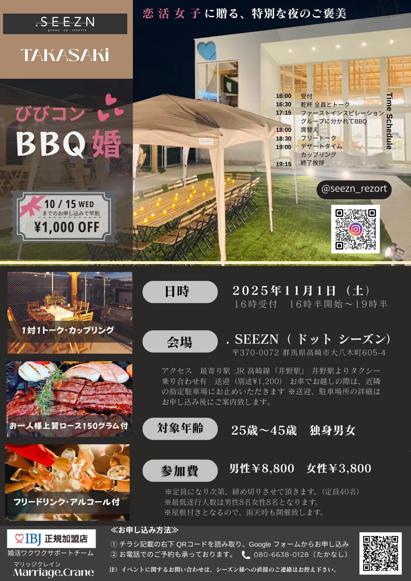1対1トーク・ファーストインスピレーション・フリートーク 連絡先交換自由・カップリング 飲食付(BBQ料理・フリードリンク・アルコール付き・デザート) |